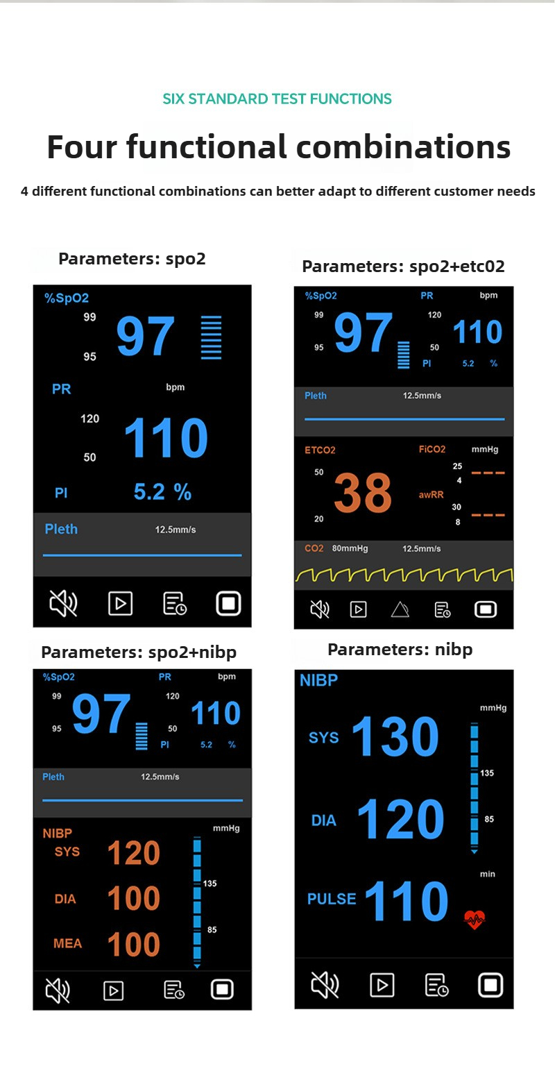 VE4B (Recommended Model):Touchscreen + SpO₂ + ETCO₂ (End-Tidal CO₂) + PR